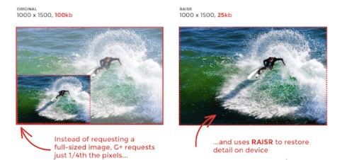 2016年,谷歌相关团队推出了一款叫做RAISR(Rapid and Accurate Image Super-ResoluTIon)的图像压缩技术。这个解决方案就是以人工智能技术作为压缩路径,效果能达到将图片压缩到源文件的1/4,却基本不改变图片的清晰度。
