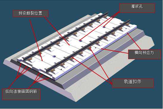 CRTS Ⅱ型板式无砟轨道则是引进的德国博格板无砟轨道技术。与CRTS Ⅰ的主要区别是,它的轨道板之间通过纵向精轧螺纹钢筋连接成纵连结构。