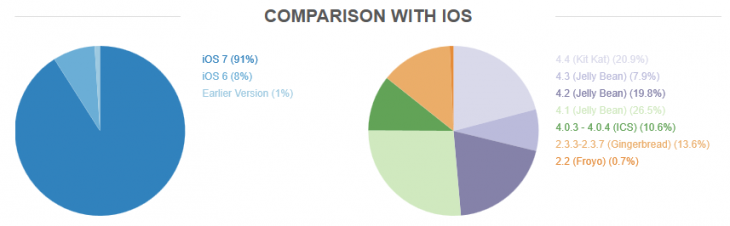 当然OpenSignal的数据并非只是针对Android,它还包括苹果。数据显示,大多数用户使用的还是Ice Cream Sandwich(Android4.0),KitKat,即Android4.4用户目前已占20.9%,另外还有14%多一点的用户依旧坚持Gingerbread(Android2.3)或Froyo(Android 2.2)。